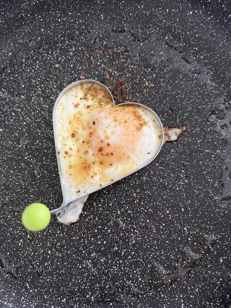 Als ich das Ei hineinlegte, lief es darunter, so dass das Ei nicht unter der Form blieb ... Das Eiweiß, wenn das Ei unter der Form lief, war eine völlige Katastrophe