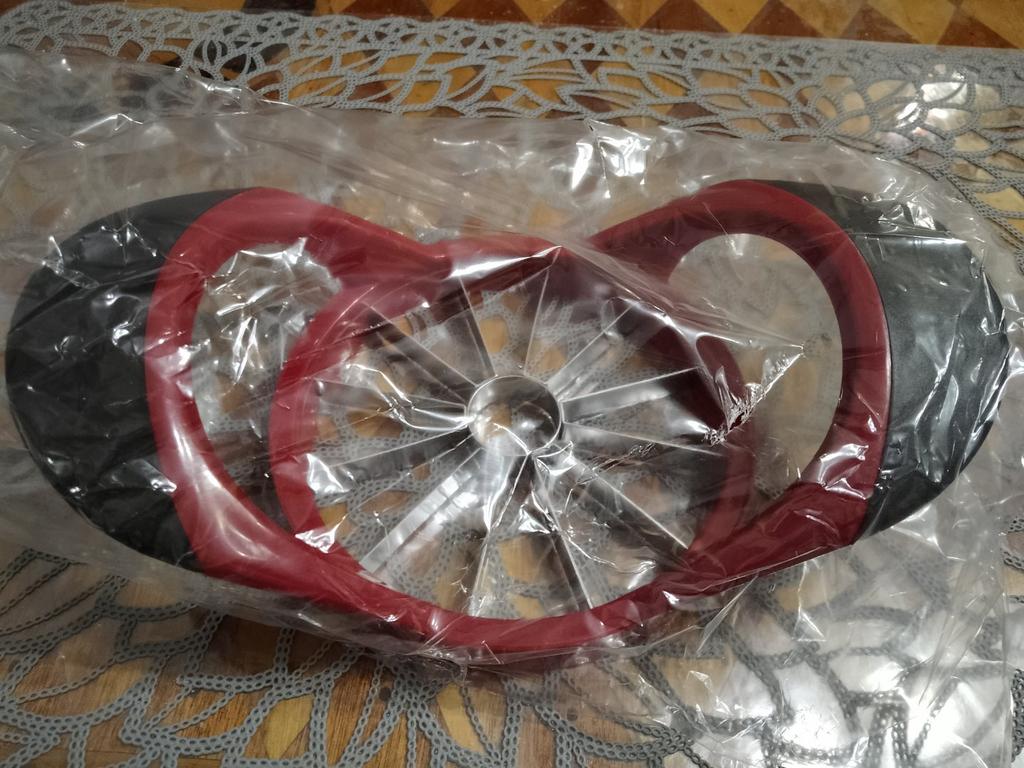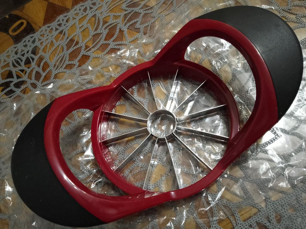 Toller Apfelschneider für 12 Spalten. Dickes, stabiles Plastik. Ich bin sicher, dass er bei der Arbeit nicht zerbricht. Bequeme Griffe, rutschen nicht.