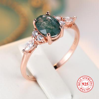 Originalität Naturstein Textur verschiedene grüne Moos Gras Achat Vouple Blumenring für Frauen Sterling Silber Geschenk Schmuck