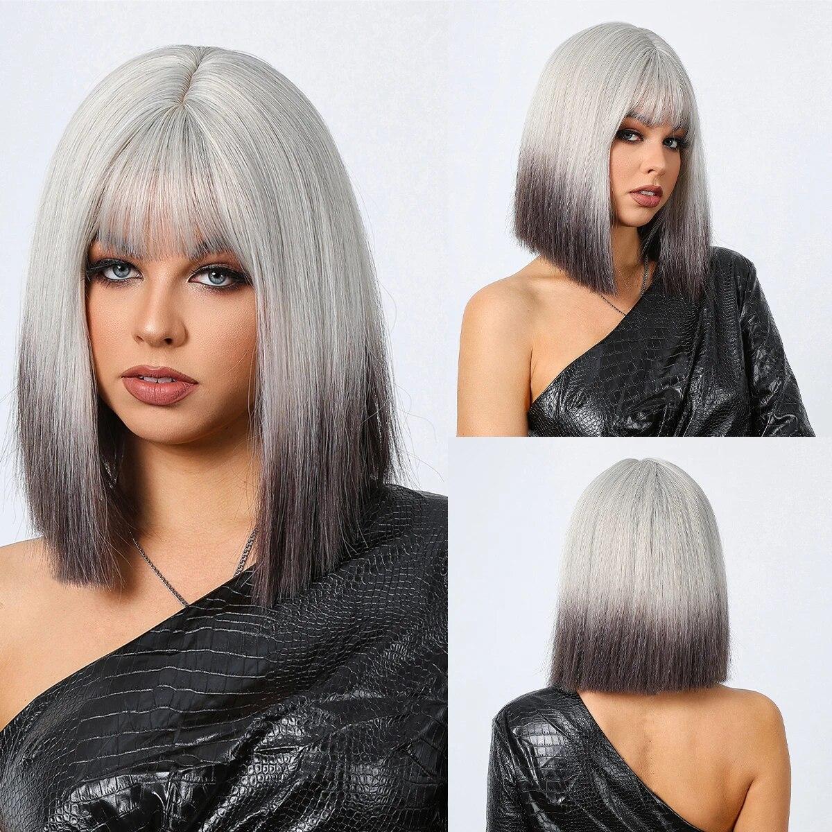 BLONDE UNICORN Kurze gerade Perücken, weiß, grau, Bob-Perücke mit Pony, natürliches Damen-Kunsthaar, tägliche Party, Weihnachten, synthetische Perücke, hohe Temperatur