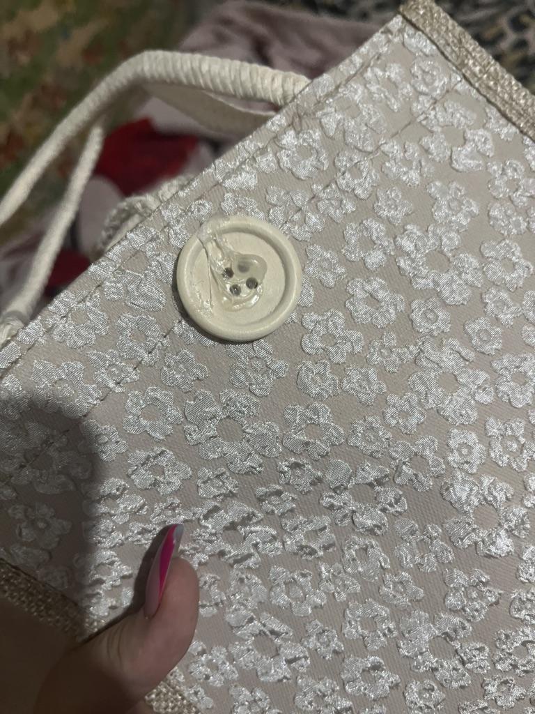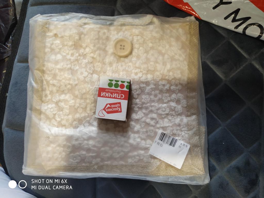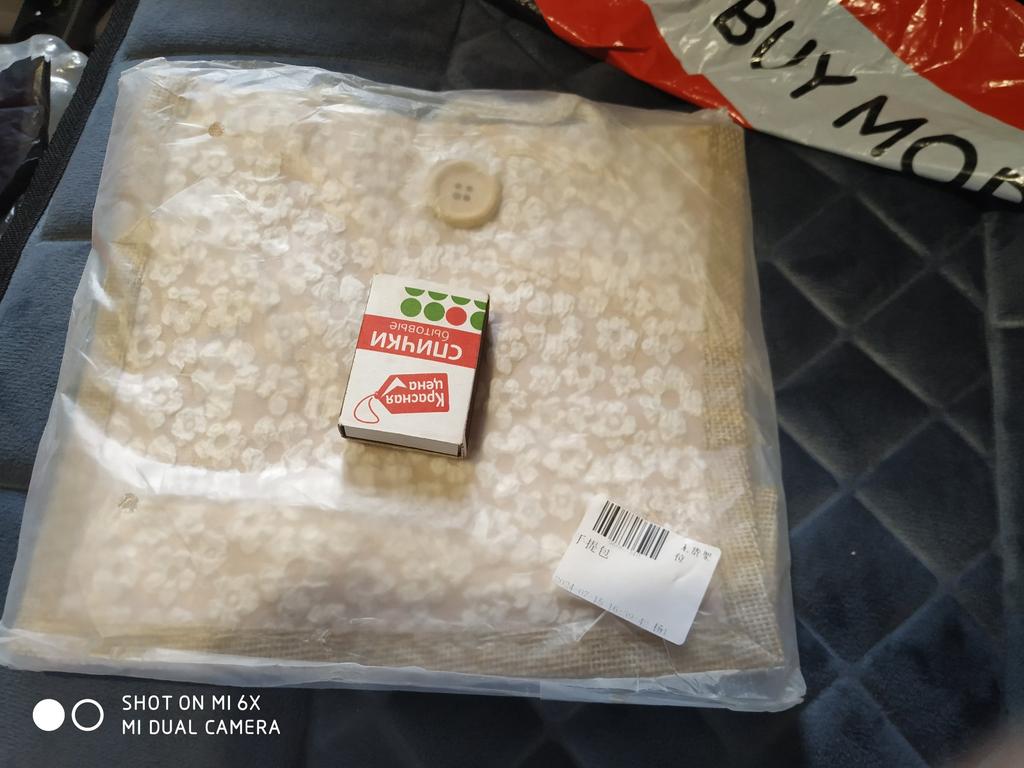 Die Handtasche ist klein, für eine Brieftasche und ein Telefon, entspricht dem angegebenen Foto, die einzige Nuance ist am Knopf, die Klebereste sind deutlich sichtbar, aber für einen solchen Preis ziehe ich keinen Stern ab, sie wurde schnell geliefert )