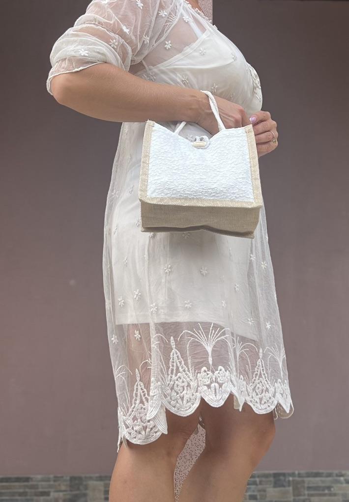 Ich habe mich vom Bild leiten lassen, die Tasche ist super klein, es ist eine mittelgroße Minitaasche, wie eine Tüte, die man im Laden bekommt, wenn man zum Beispiel eine Creme kauft, für Schade, so klein ist die Tasche. Danke, es wird auch dazu dienen, das Telefon, die Schlüssel und die Geldbörse abzulegen.