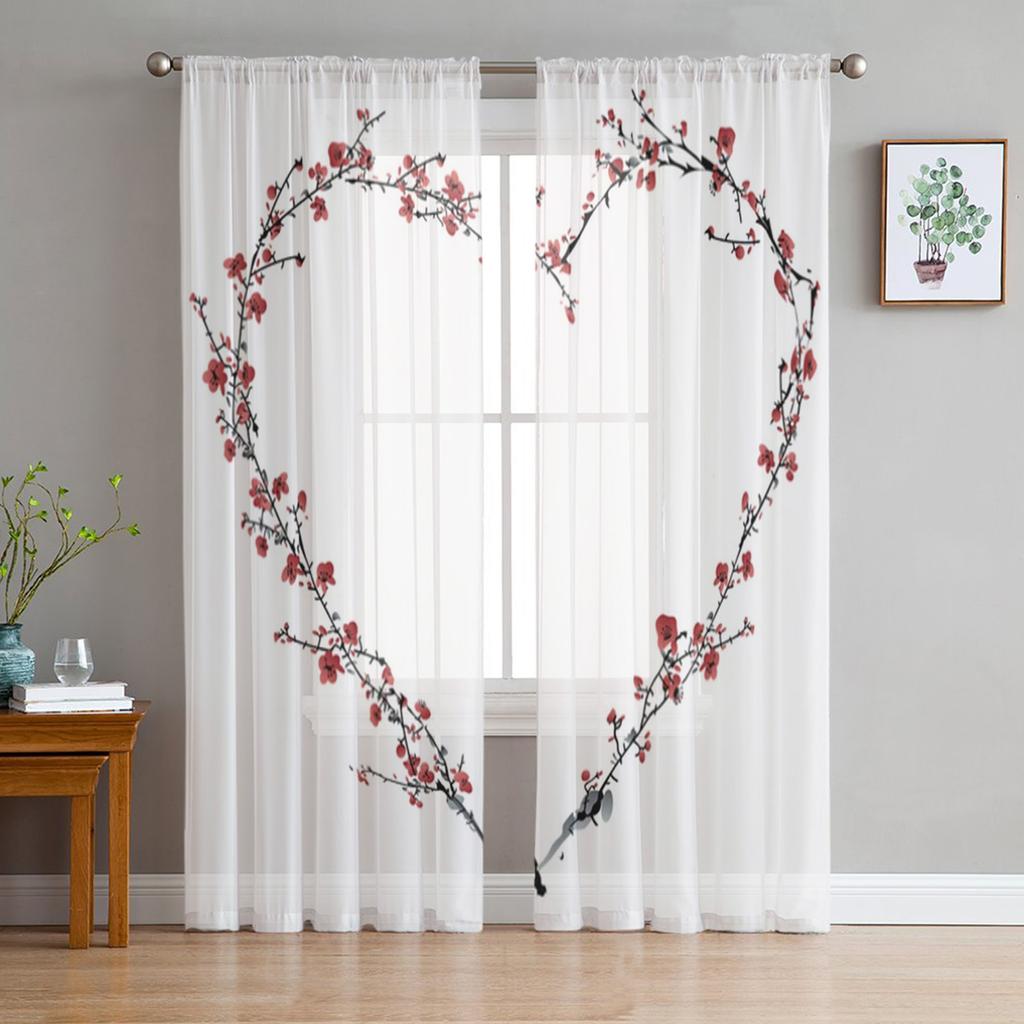 Pflaumenblütenzweig Liebesherz Transparente Vorhänge für Wohnzimmer Schlafzimmer Tüllvorhänge Küchenfensterdekorationen Paneelvorhänge