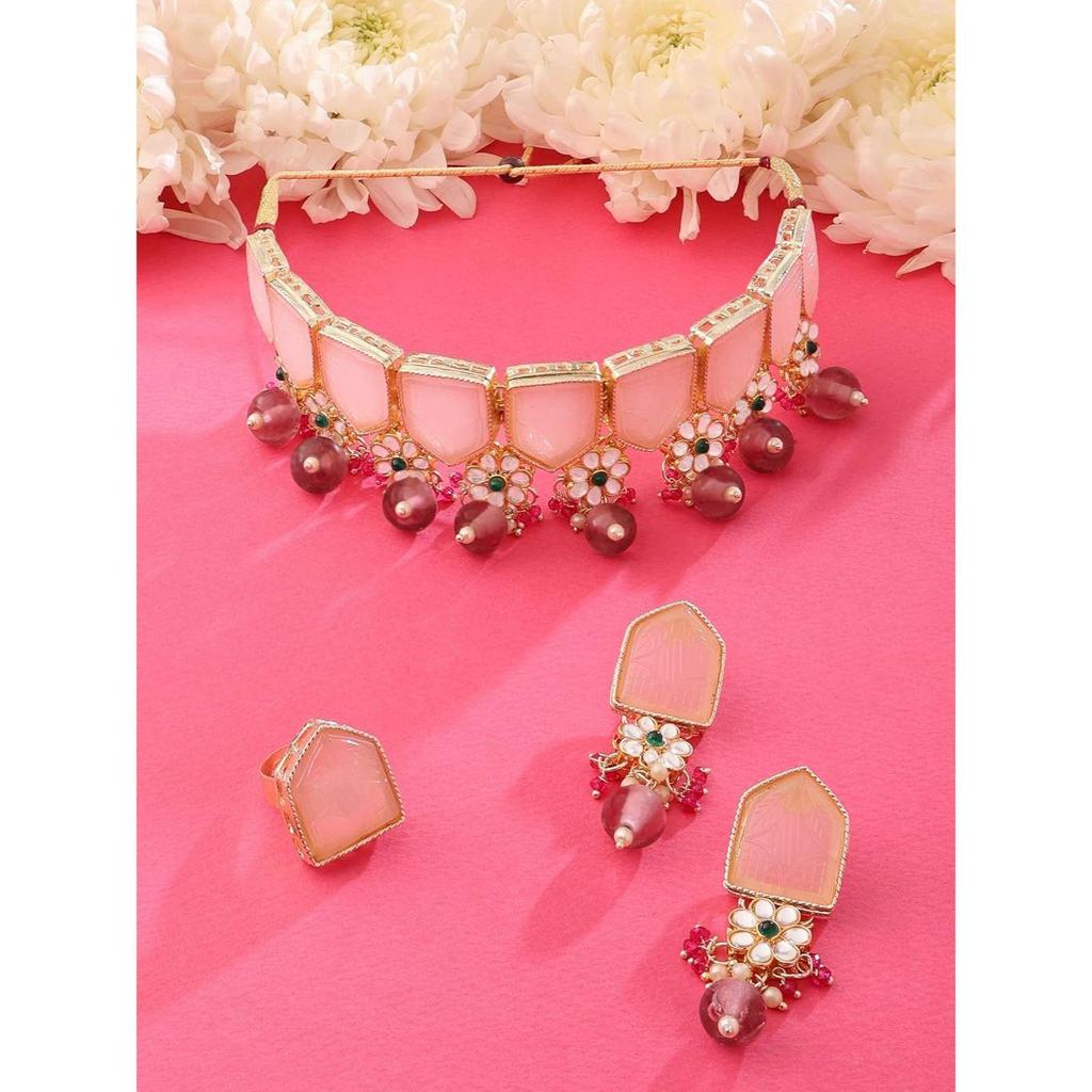 Rosa-grüne Steine, Perlen, Kundan-Choker-Halskette, Ohrringe und Ring-Set für Frauen