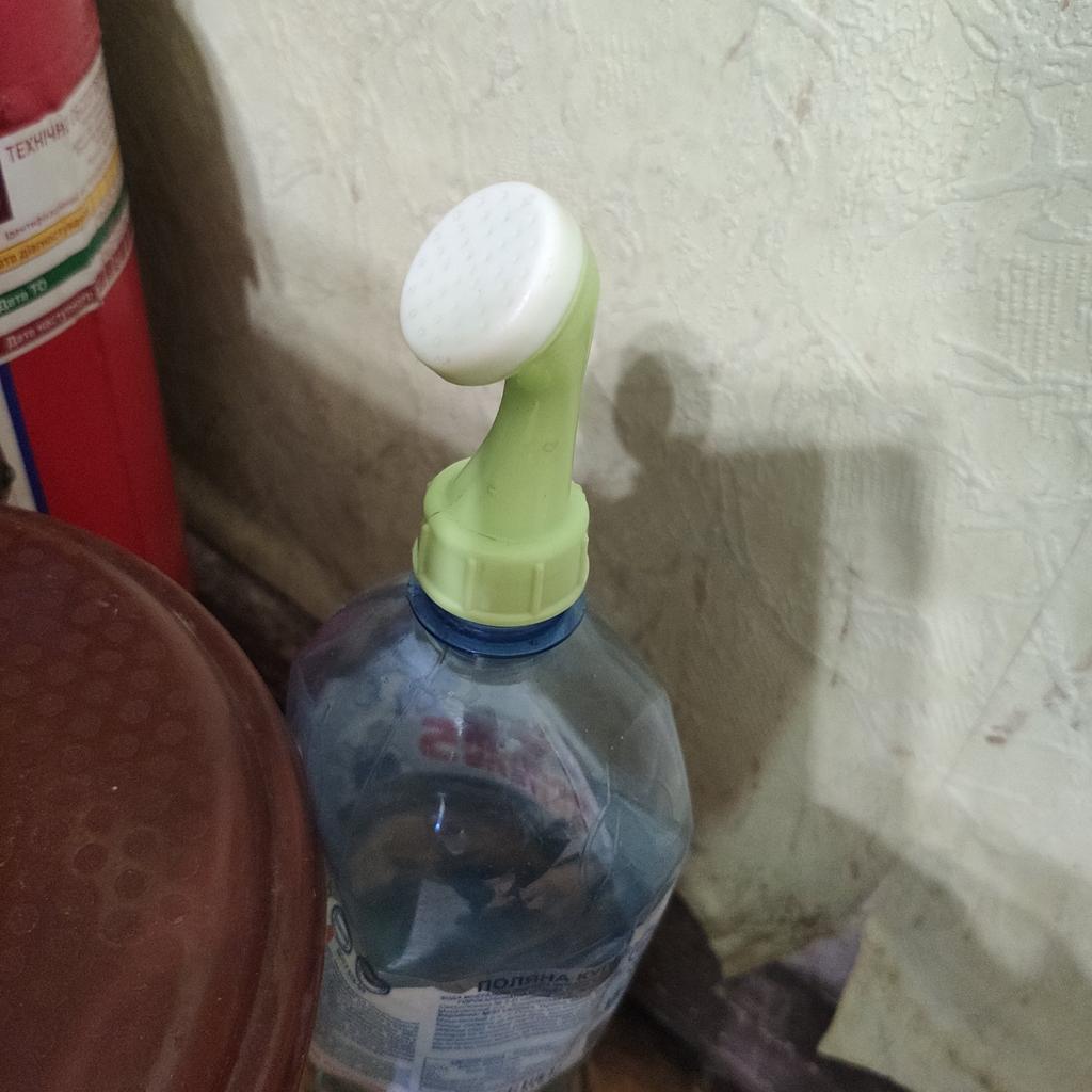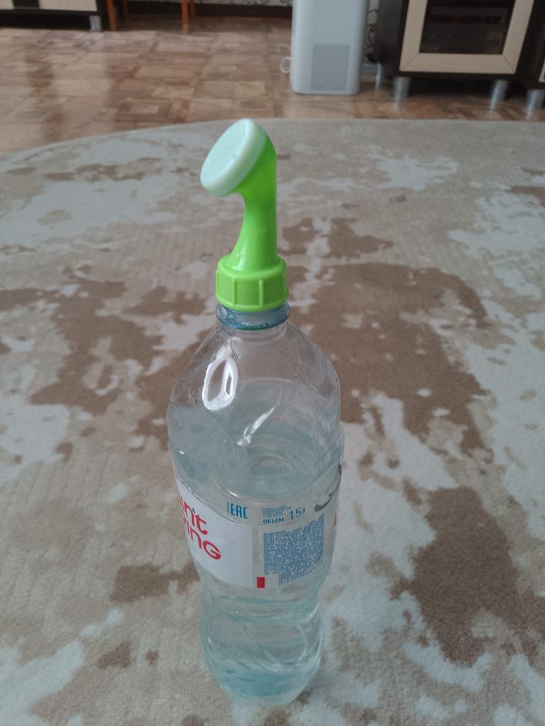 Auf eine normale Plastikflasche von Mineralwasser mit anderthalb, 2 Litern lässt sie sich normal aufschrauben. Gießen ist bequem.