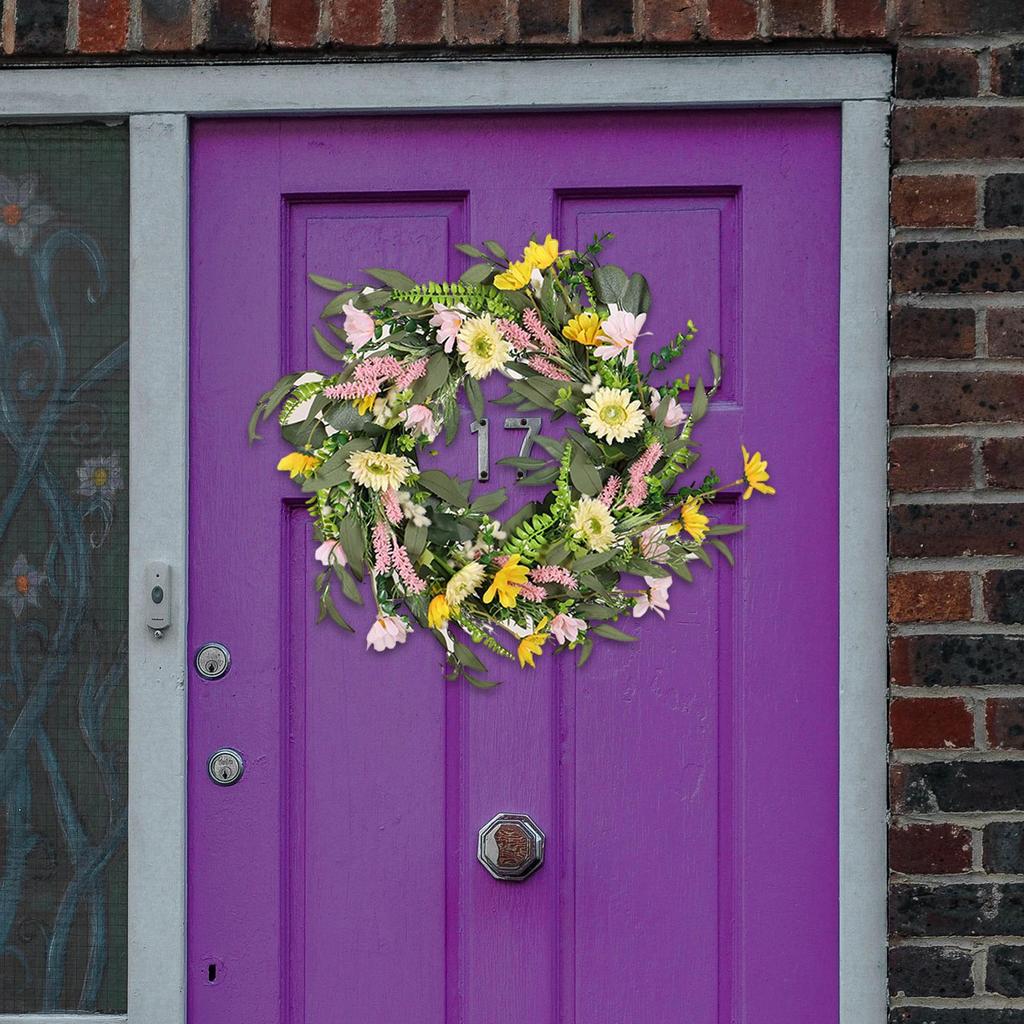- 【Frühlingskranz mit Ornamenten】: Der Kranz an der Haustür ist mit grünen Eukalyptusblättern und mehrfarbigen künstlichen Gänseblümchen dekoriert und sorgt für realistische visuelle Effekte und ein Frühlingsgefühl.