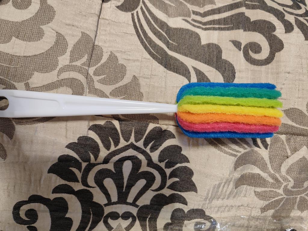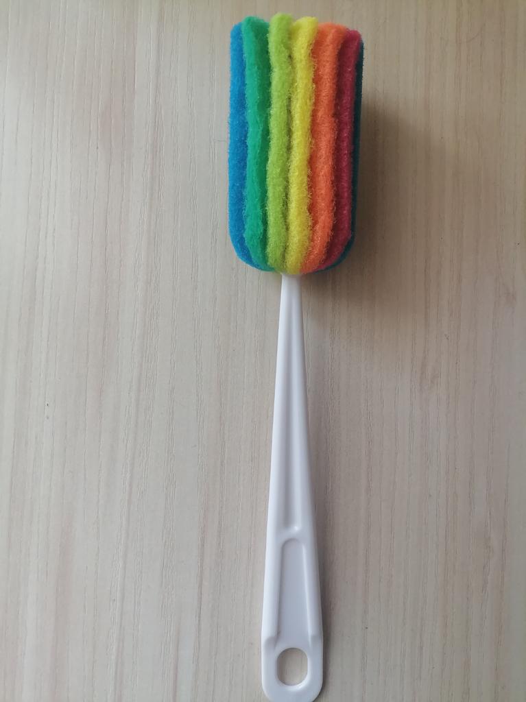 Der Griff ist etwas kurz, bei einer Fitnessflasche mit 1 Liter Fassungsvermögen versinkt er unter dem Hals, das Material der Bürste ist wie bei einem Scheuerschwamm, ich hätte gerne etwas Weicheres, zum Beispiel Schaumstoff.