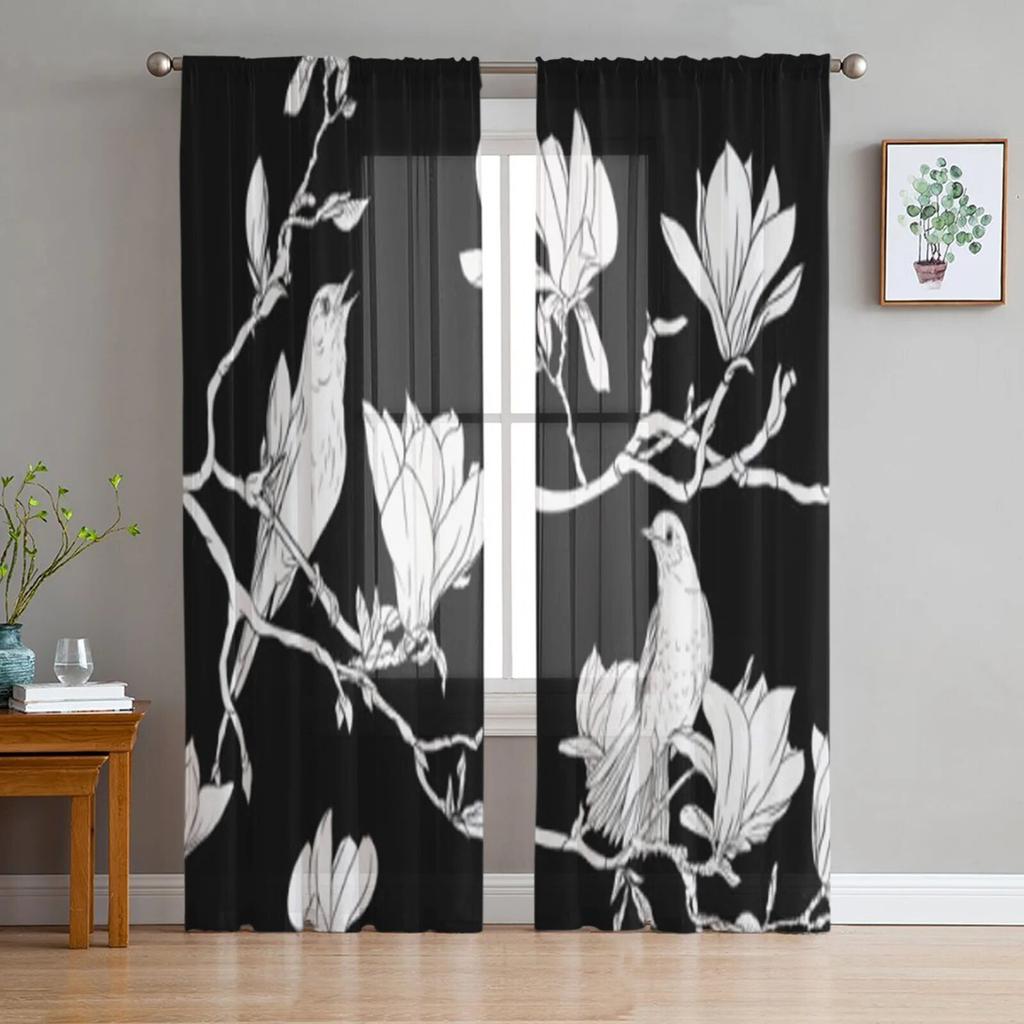 Magnolienzweig mit Blumen und Vogelfenstervorhängen, transparenter Chiffon-Tüllvorhang, Heim- und Wohnzimmer-Hintergrunddekoration