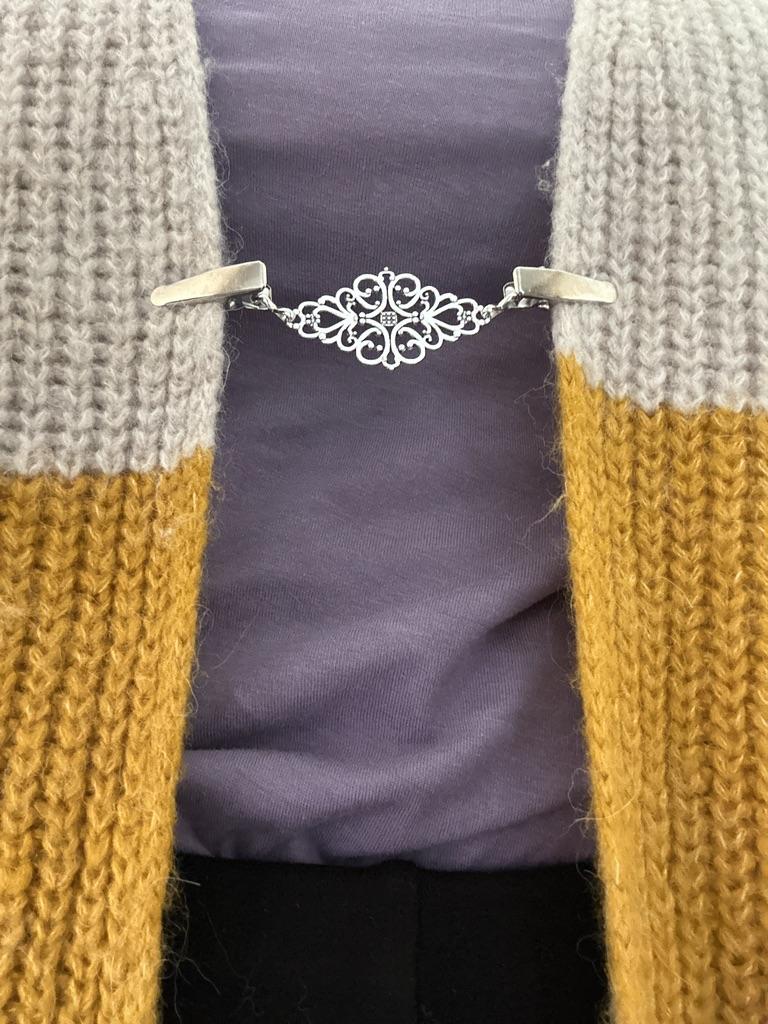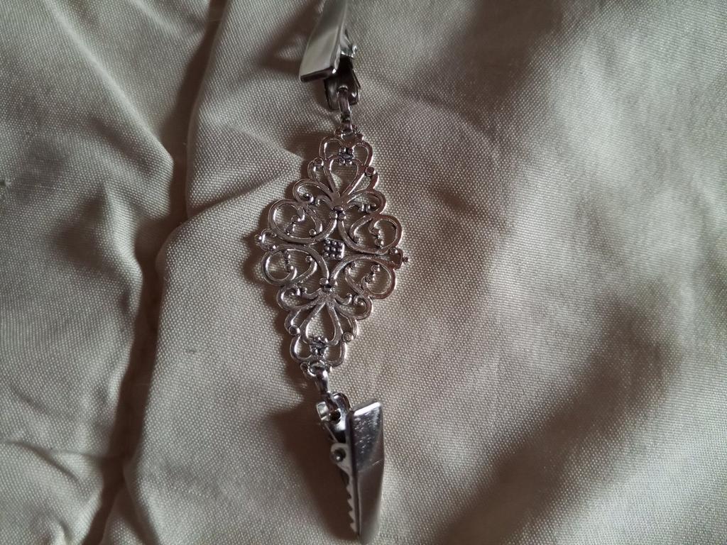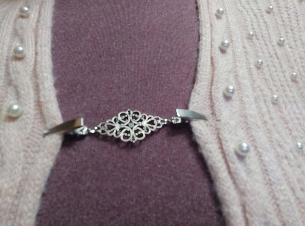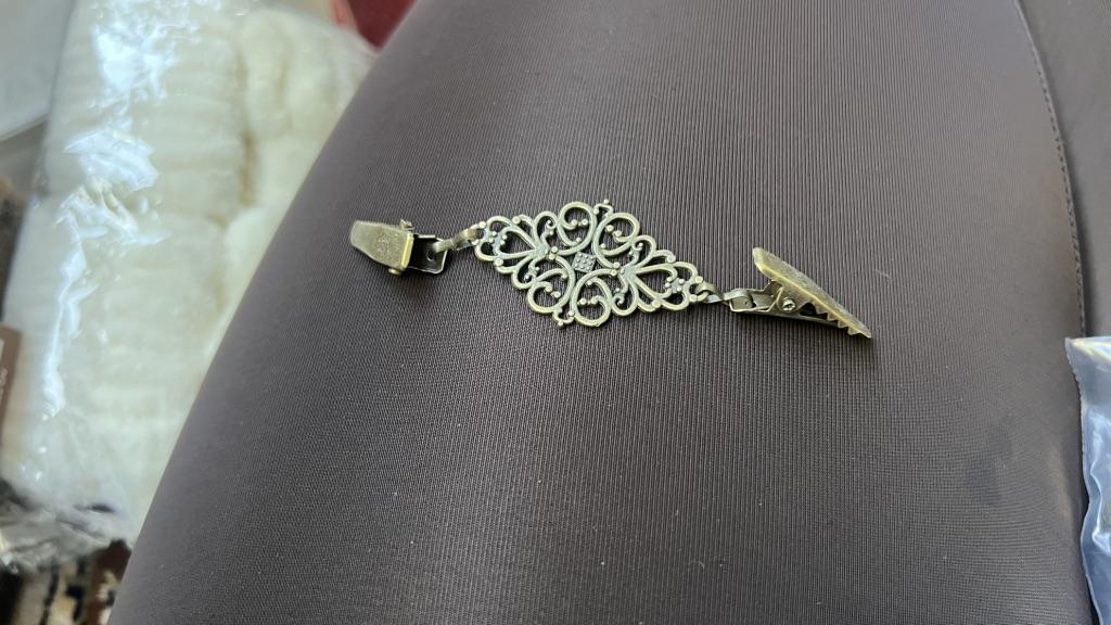 Tolles Produkt. Perfekt, um eine Strickjacke oder ein Tuch zu halten, als ob es geschlossen wäre/ um zu verhindern, dass es von den Schultern rutscht. Hübsches Filigranmuster in der Mitte. Die Klammerteile sind wie Krokodilklemmen.