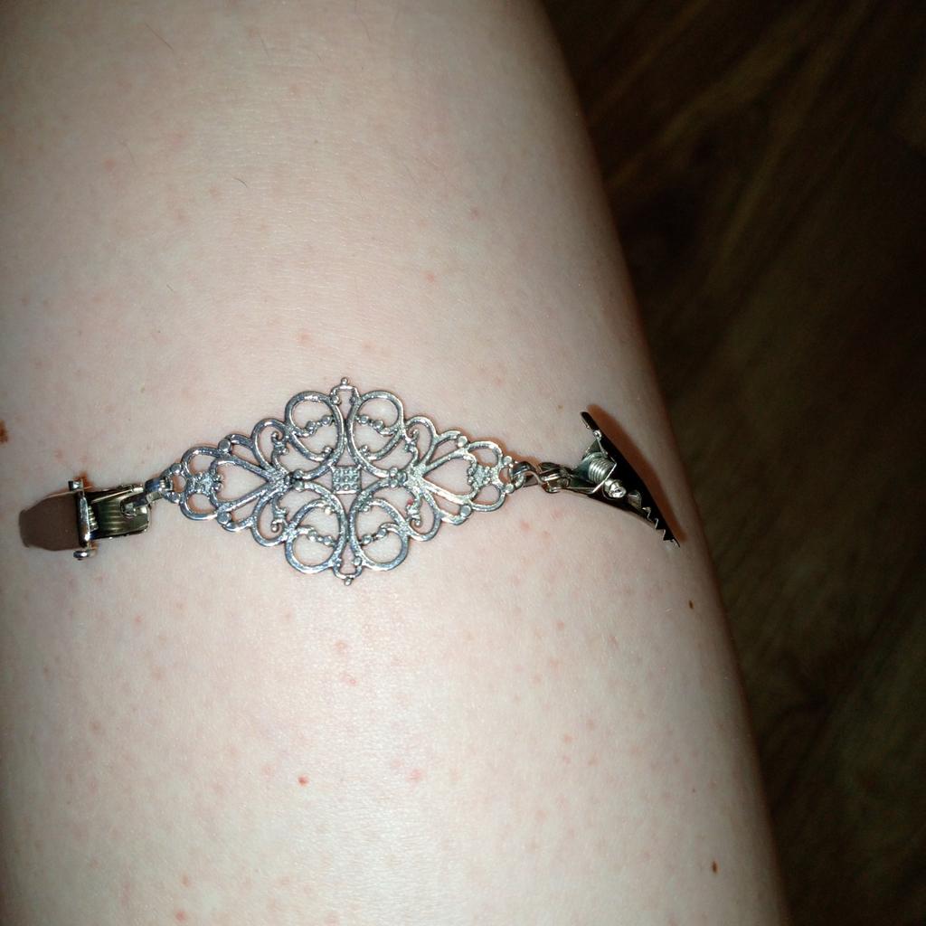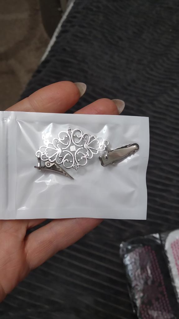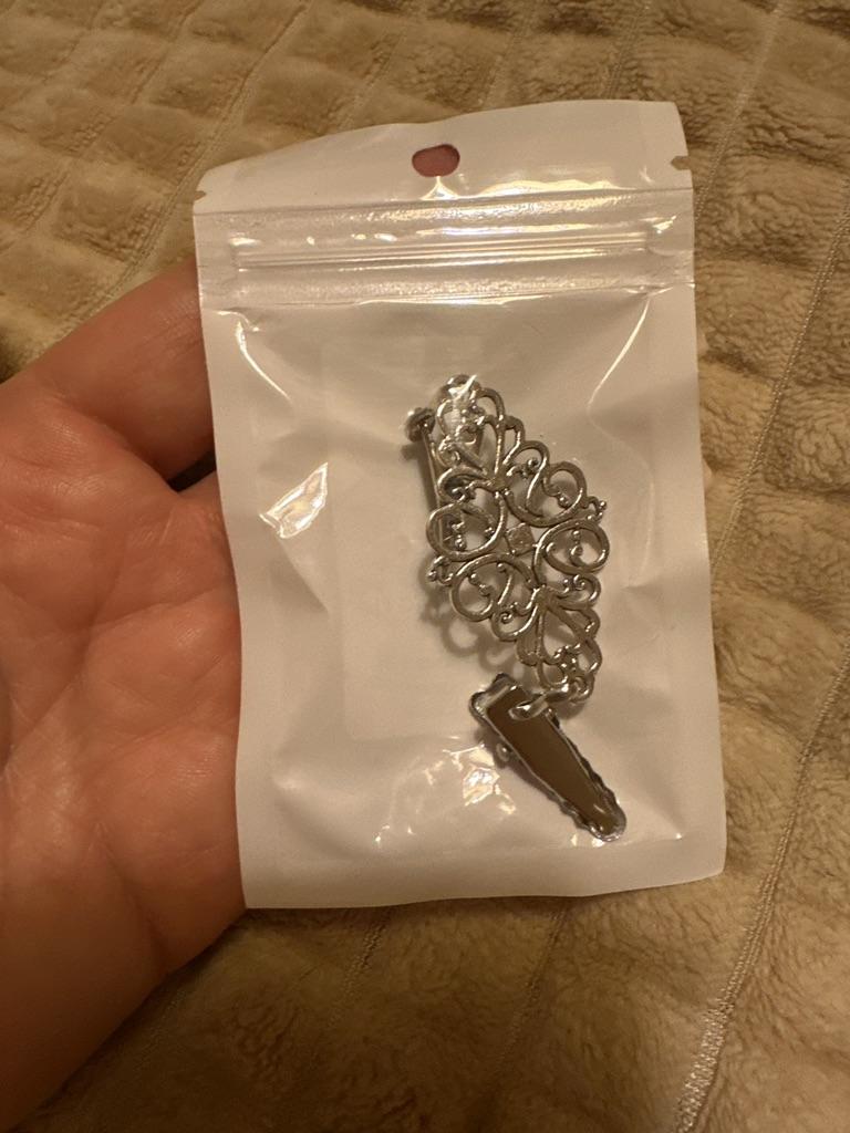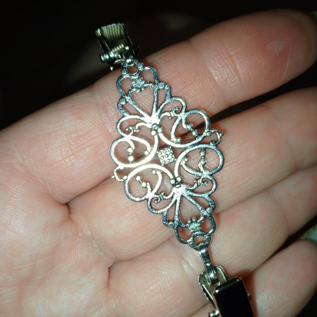 Tolles Produkt. Perfekt, um eine Strickjacke oder ein Tuch zu halten, als ob es geschlossen wäre/ um zu verhindern, dass es von den Schultern rutscht. Hübsches Filigranmuster in der Mitte. Die Klammerteile sind wie Krokodilklemmen.