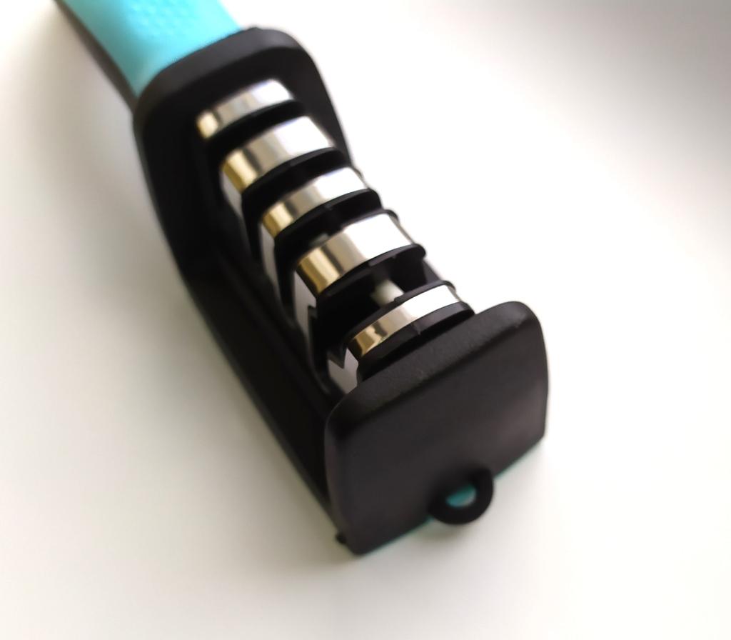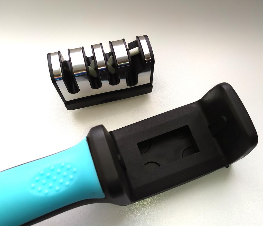 Schärfer für Messer und Scheren, kompakter Messerschärfer zum mechanischen Schärfen von Messern, 4 Schärfschlitze. Der manuelle mechanische Schärfer ist zum Schärfen von Allzweckbesteckmessern, Kochmessern, Gemüsemessern, japanischen Kochmessern, Santokumessern, Küchenbeilen und einem Satz Küchenmesser, Jagdklappmessern, allen Arten von Angelmessern und klappbaren Touristen-Schmetterlingsmessern aus Stahl bestimmt. Zone 1 – grobes Schärfen. Zone 2 – sanftes Schärfen. Zone 3 – Feinbearbeitung der Klinge. Zone 4 – Schere schärfen. Das Zubehör sorgt dafür, dass Messer genauso scharf bleiben wie ein elektrischer Schärfer. Der Körper verfügt über einen bequemen ergonomischen Griff mit bequemem Handgriff – besonders wichtig für Frauen abnehmbarer Schärfschlitz Auf der Unterseite befinden sich gummierte Einsätze, die ein Verrutschen des Geräts auf der Oberfläche verhindern.