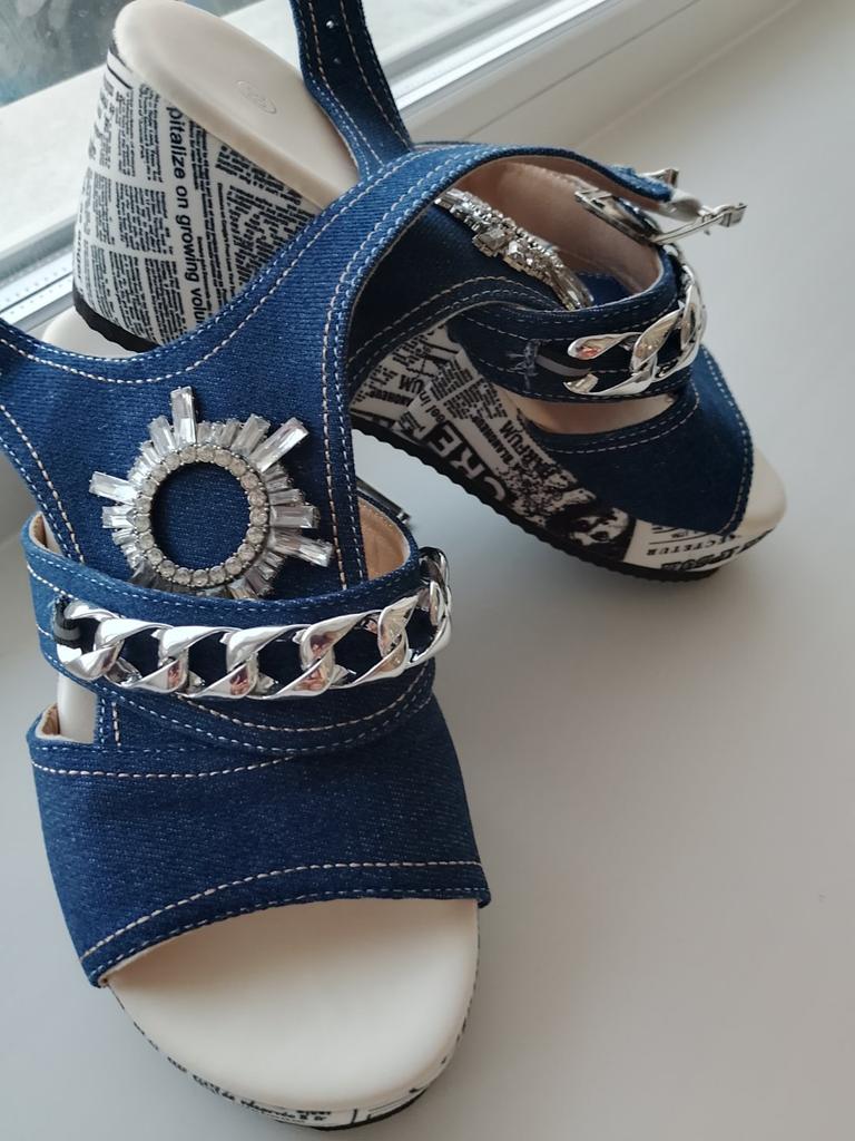 Damen-Sandalen mit Strass-Kette, Keilabsatz, hoher Absatz, Denim-Stoff, offener Zehenbereich, Knöchelriemen, Schnalle, zufälliges bedrucktes Design, lässige Sommerschuhe