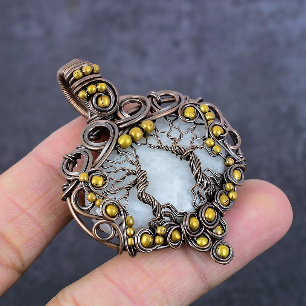 Natürlicher Regenbogen Mondstein Handgemachter Kupferdraht Wickelschmuck Anhänger 2,36" N9G58