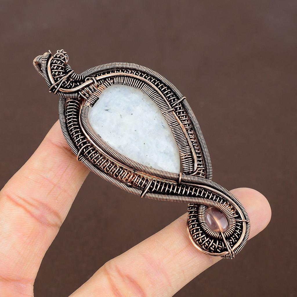Natürlicher Regenbogen Mondstein,Rosenquarz Stein Kupferdraht Wickel Anhänger 3,54" P5J91
