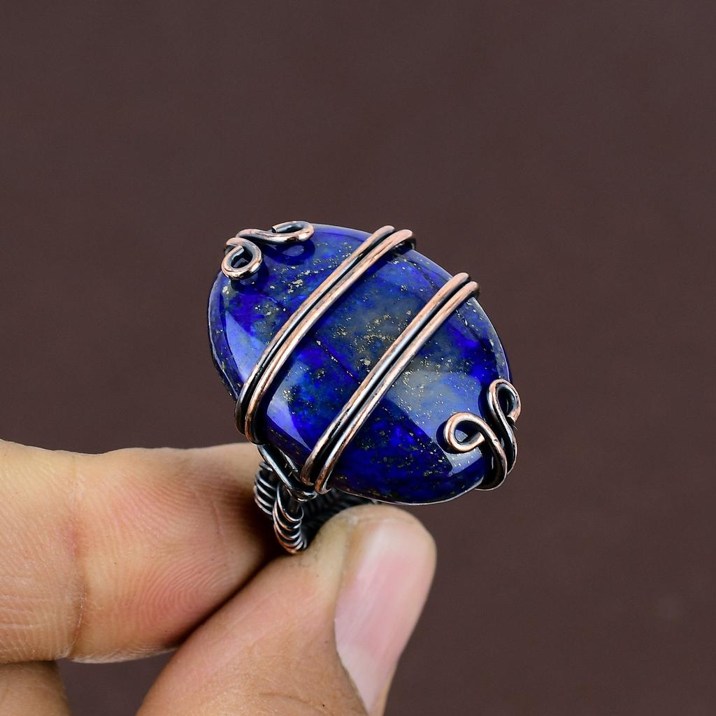 Natürlicher Lapislazuli Edelstein Handgefertigter Kupferdraht Wickelring Größe 5.5 H5d62