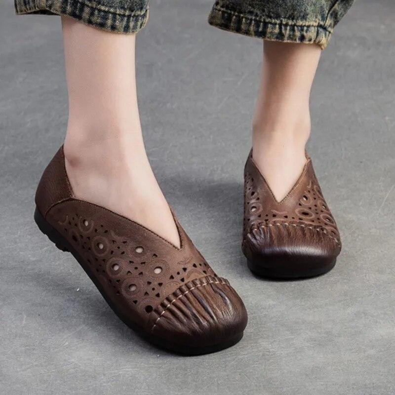 Johnature Retro-Echtleder, ausgehöhlt, atmungsaktiv, flache Schuhe, runde Zehen, lässige Damen-Slip-on-Schuhe
