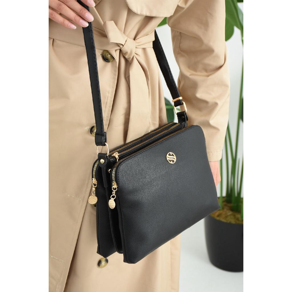 Schwarze Damen-Schultertasche aus weichem Leder mit 4 Fächern, langem Kreuzriemen, mittlerer Größe, nützliche Umhängetasche