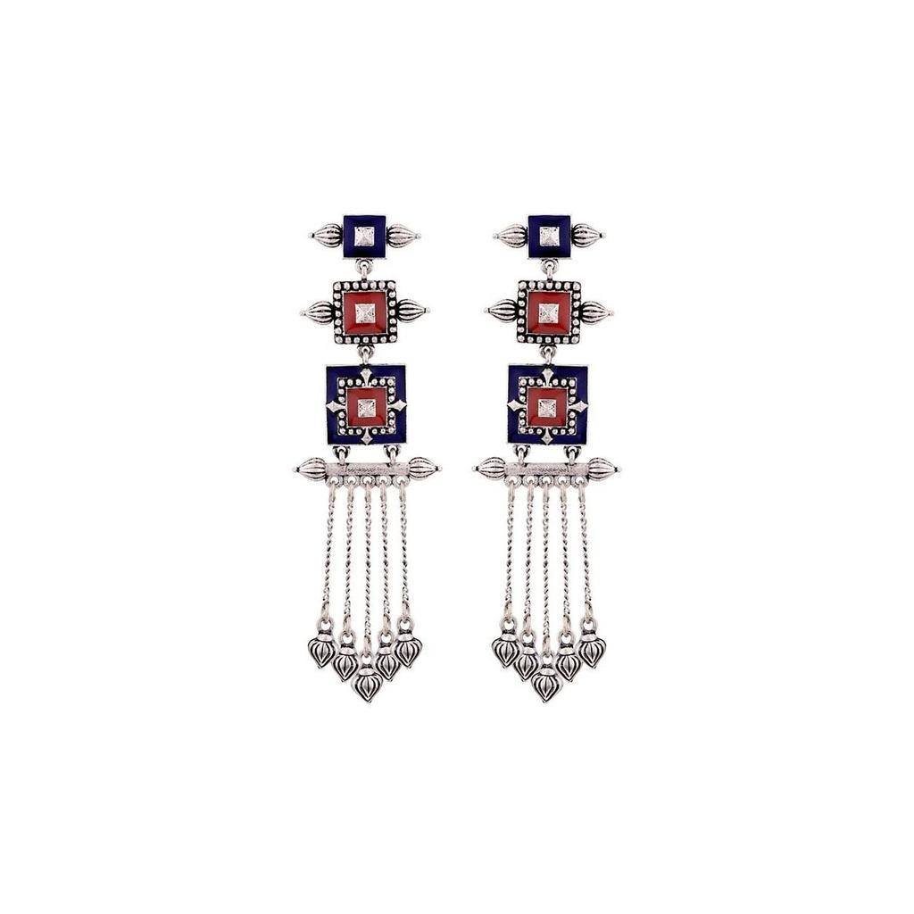 Ohrringe aus oxidiertem Messing und Silber mit Mandala-Muster, mehrlagig, quadratisches Design, Quasten für Frauen und Mädchen