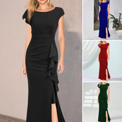 Frauen Sommer O hals Kurzarm Kleid Kleid Hohe Taille Seite Rüschen Dekor Split Saum Slim Fit Hüfte Gewickelt abend Party Kleid