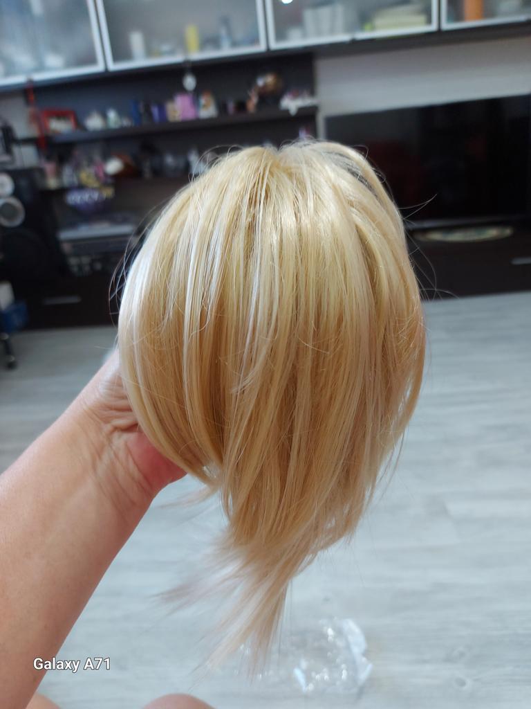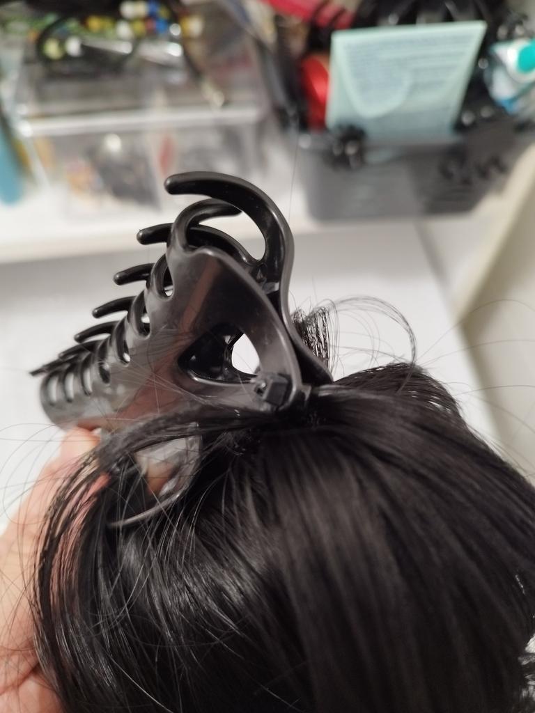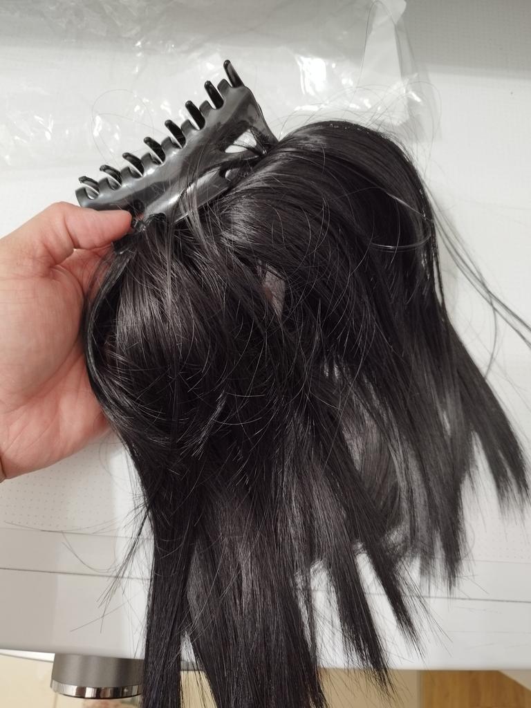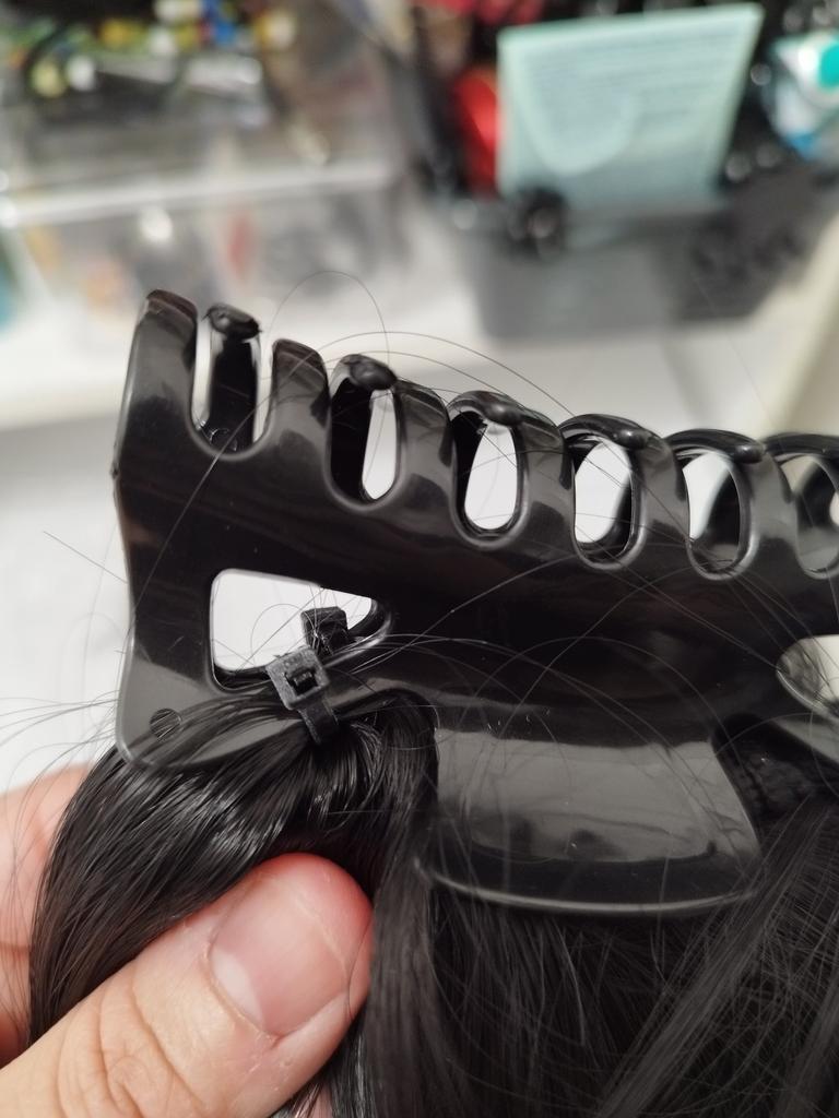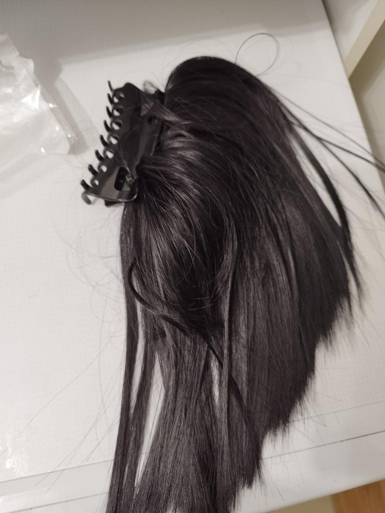 Das Haarteil wurde mit Kabelbinder befestigt und die Enden davon so abgeschnitten sodass es spitz geblieben ist. Fazit - es sticht und zieht an den Haaren. Das tut die Haarklemme übrigens auch. Das hat auch so ein paar Stellen die abgerundet gehören. Außerdem sehen die Haare nicht so voluminös aus wie auf den Fotos.