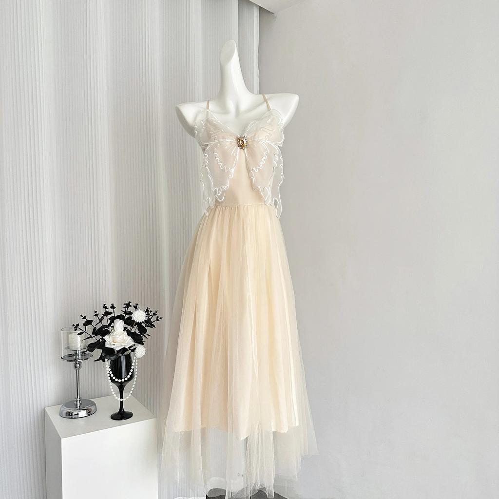Süßes Maxikleid mit Spaghettiträgern und Schleife im französischen Stil aus Tüll für den Sommerurlaub – schickes ärmelloses Kleid für Damen