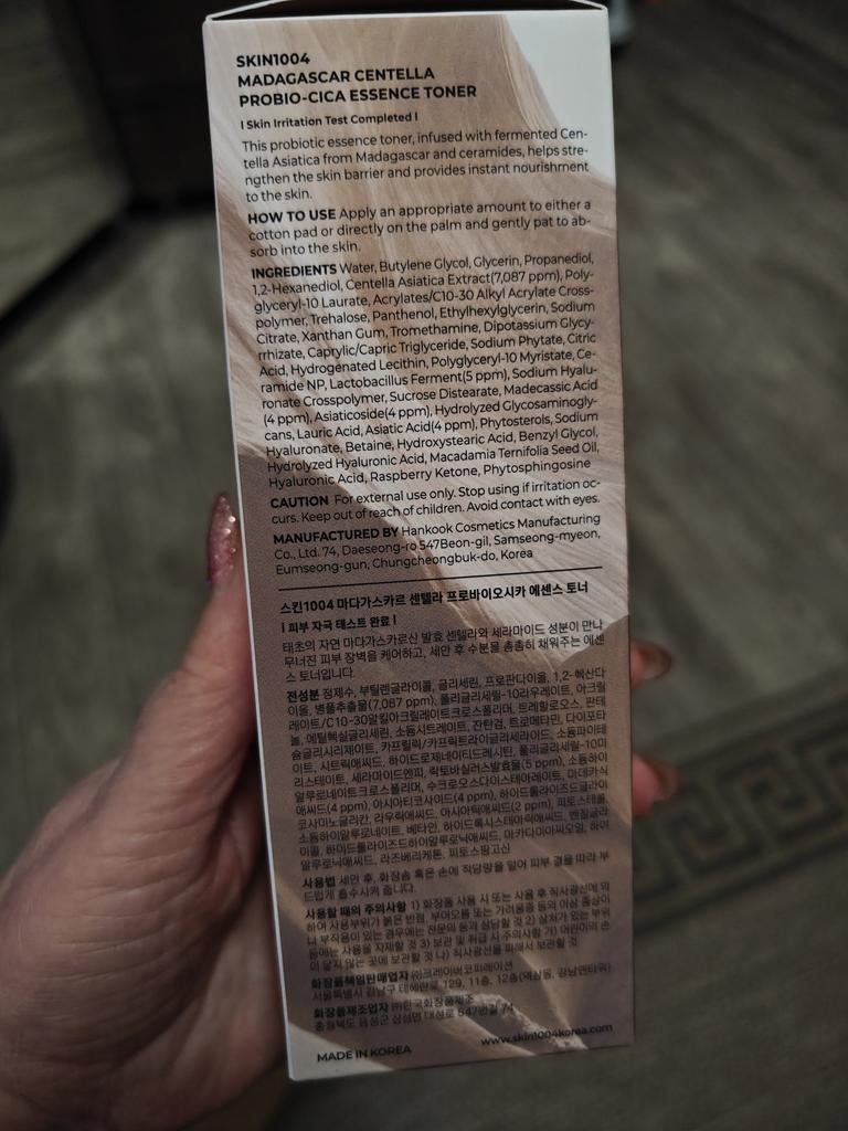 Zutaten : Centella Asiatica-Extrakt, Wasser, Butylenglykol, Glycerin, Polypropandiol, Lactobacillus/Centella Asiatica-Extrakt-Fermentfiltrat, Polyglyceryl-10-Laurat, Kaliumacrylate/C10-30-Alkylacrylat-Crosspolymer, Trehalose, Panthenol, Ethylhexylglycerin, Natriumcitrat, Xanthangummi, Tromethamin, Dikaliumglycyrrhizat, Capryl/Capric-Triglycerid, Natriumphytat, Zitronensäure, hydriertes Lecithin, Polyglyceryl-10-Myristat, Ceramid NP, Natriumhyaluronat-Crosspolymer, Saccharose Distearat, Madecassinsäure, Asiaticosid, hydrolysierte Glykosaminoglykane, Laurinsäure, Asiatinsäure, Phytosterole, Natriumhyaluronat, Betain, Hydroxystearinsäure, Benzylglykol, hydrolysierte Hyaluronsäure, Macadamia Ternifolia-Samenöl, Hyaluronsäure, Himbeerketon, Phytosphingosin