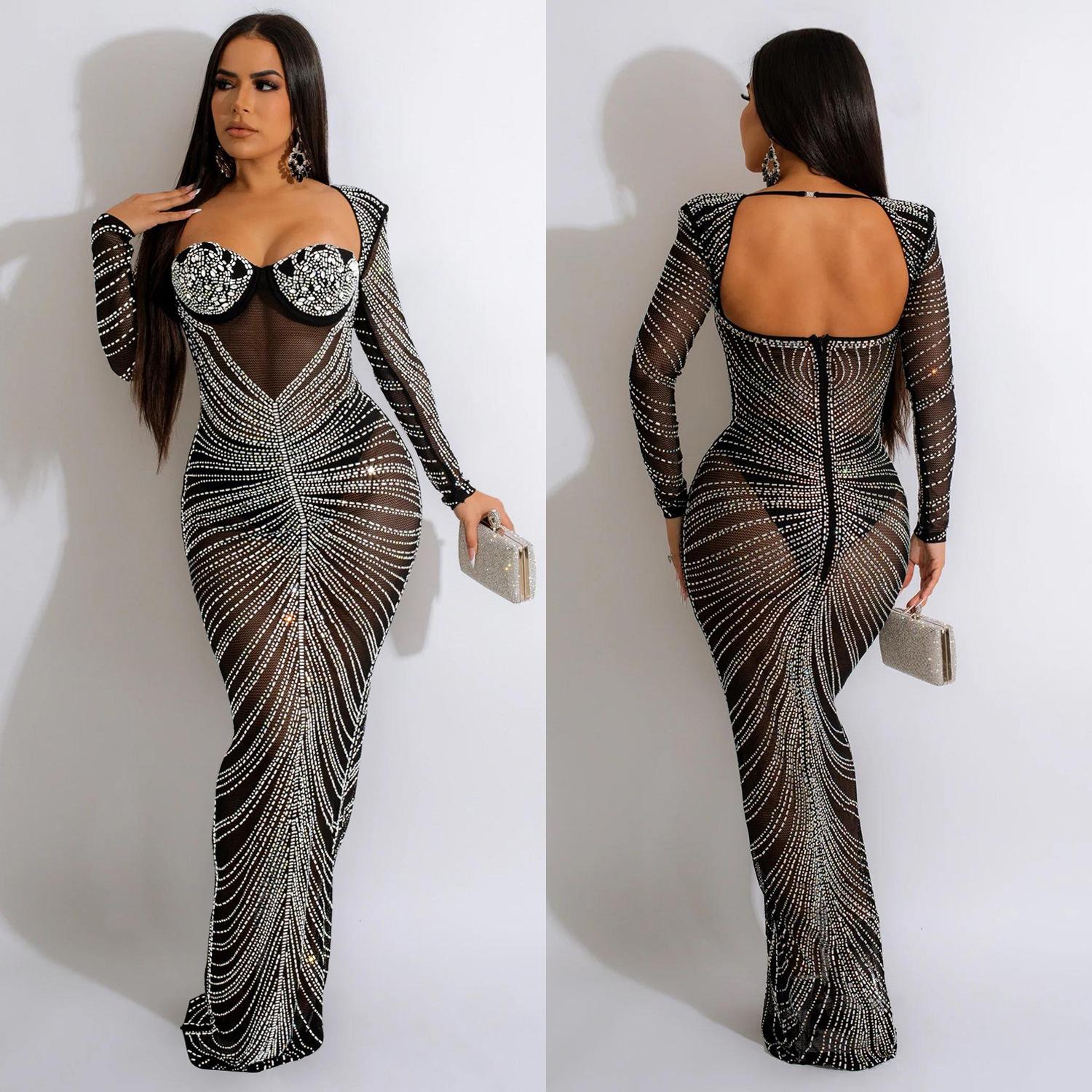 Modisches, durchsichtiges, langärmliges Kleid aus Drillichnetz für Damen
