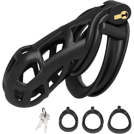 Male Cock Cage Chastity Device Tease Resin Chastity Locked Cage with 4 Different Size Rings for Male Penis Exercise Sex Factory (Black)