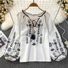 Frühling Herbst Casual Frauen Bluse Mode V-ausschnitt Langarm Stickerei Shirts Vintage Minderheit Damen