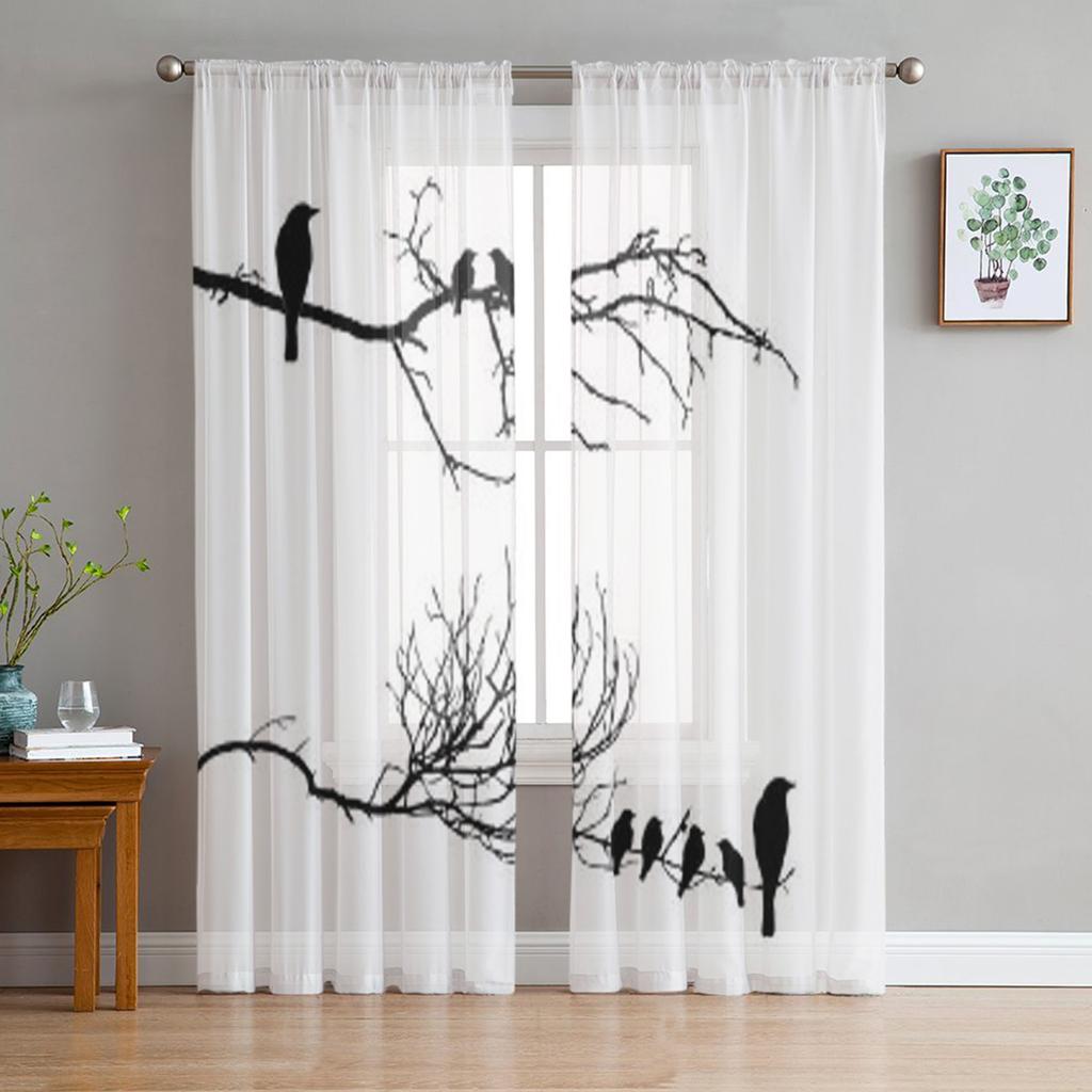 Silhouette der Vögel auf dem Zweig, Chiffon-Vorhänge für Wohnzimmer, Schlafzimmer, Dekoration, Fenster, Voiles, Tüllvorhang