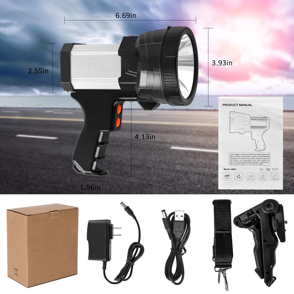 【IP65 Waterproof Heat Dissipation】- The portable spotlight used impact-resistant ABS material resistance to fall off. IP65 waterproof rechargeable spotlight flashlight is able to work on high temperatures, rain, or snowy days. If you accidentally drop it in the water while hiking, camping, or hunting, no worries - it's IP65 waterproof up to 3ft deep, and floats to the surface of the water so it's easy to retrieve.