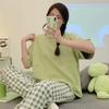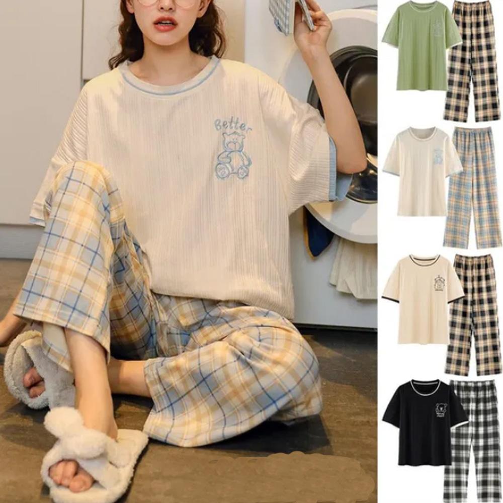 Damen-Set, modisch, kurzärmelig, Rundhals-Pullover, Oberteil, karierte Hosen, lockeres, bequemes Heim-Outfit, Nachtwäsche, Homewear-Pyjama, 2-teilig