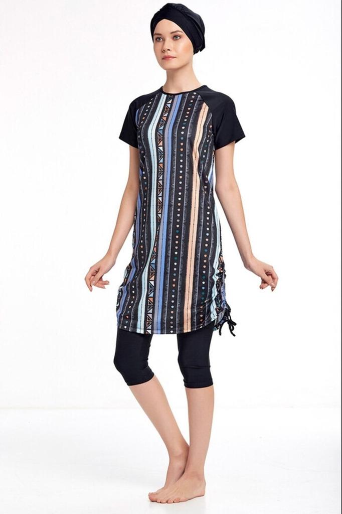 Halbbedeckter Lycra-Badeanzug mit kurzen Ärmeln und Hijab 3409 Schwarzer halbbedeckter Badeanzug besteht aus 3 Teilen: Kurzärmliges Oberteil, kurze Strumpfhose und Haube.