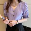 Einfarbiges Chiffonhemd Damen Kurzarmhemd Sommermode Vielseitig Locker V-Ausschnitt Puffärmel Tops