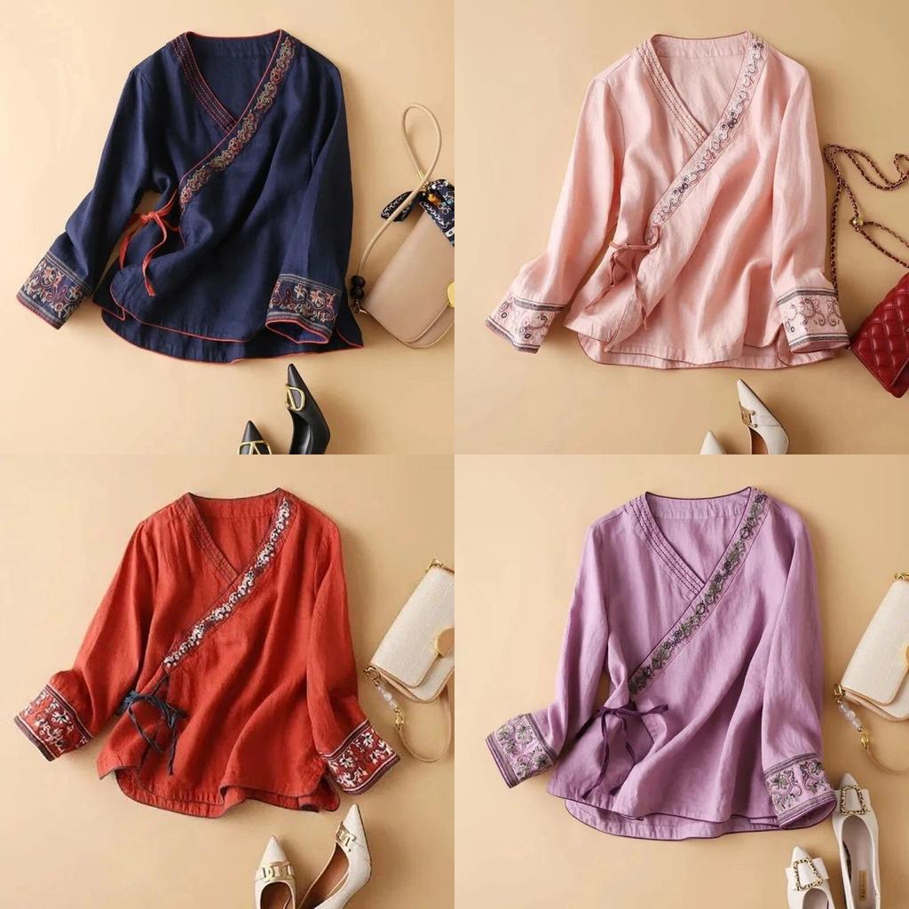 Sommerbluse aus Baumwolle und Leinen im ethnischen Stil für Damen mit schrägem Revers und Stickereien, literarische Retro-Bluse, lockere verbesserte Hanfu-Kleidung im antiken Stil, Tee-Zen-Kleidung