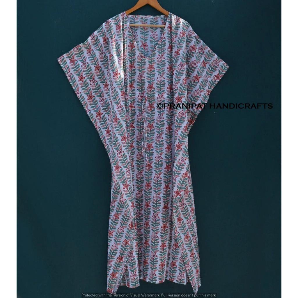 Damen Hippie Baumwolle Sommer Nachtwäsche Blumendruck Weiß Langes Maxi Kaftan Kleid CKFTN-SCRN-FULL-BUYIT-097