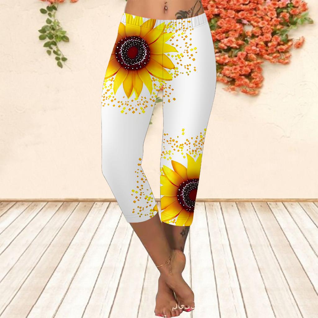 Lange Hosen, kurze Sommerleggings, kurze, enge Hosen, Übergrößen-Leggins, schmal geschnittene lange Hosen für Damen mit 3D-Sonnenblumen-Aufdruck