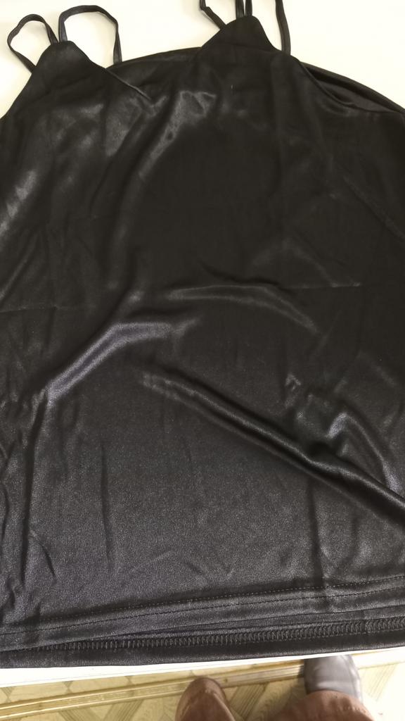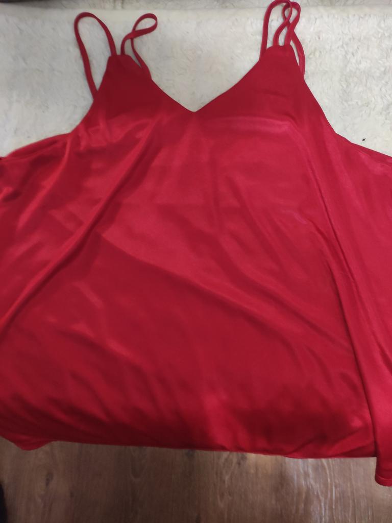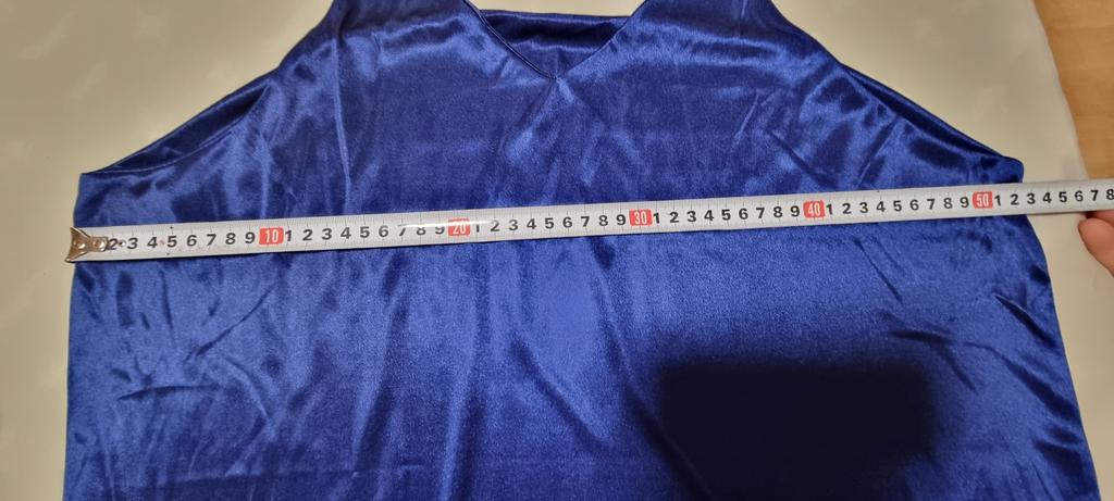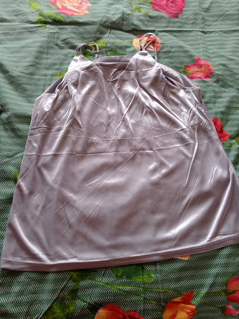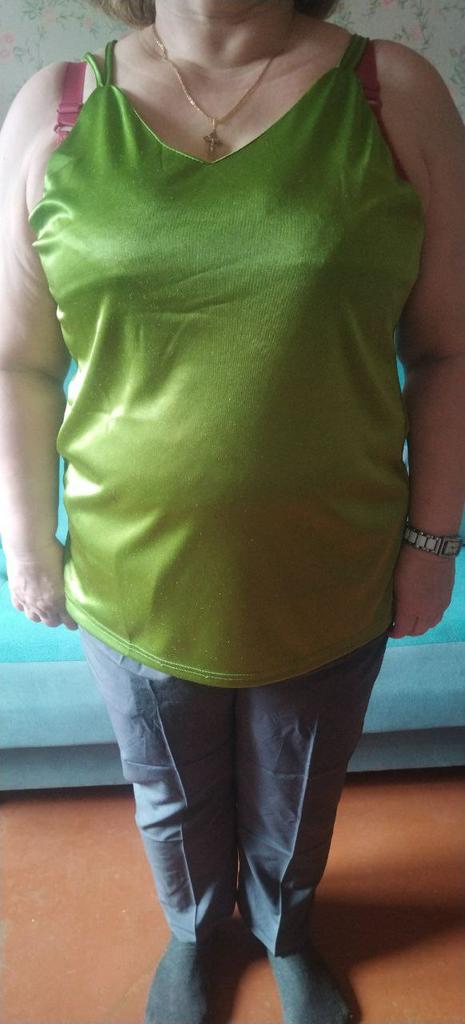 Das Oberteil passt bei Größe 52, ich dachte allerdings der Stoff wäre Satin, es ist jedoch glänzender Jersey.