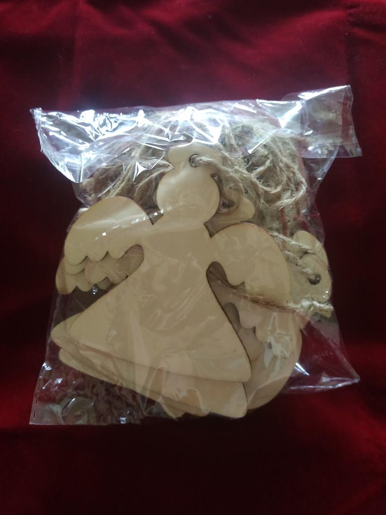 Entzückende Formen: Holzornamente sind in verschiedenen Formen einschließlich Engel, Stern, Schneeflocke, runde Scheibe und Weihnachtsbaum, mit glatter Kante, sie sind zart und schön