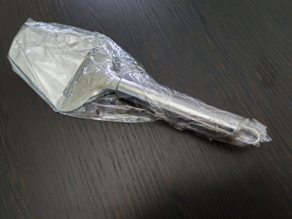 Wie auf dem Foto. Habe eine größere genommen, als Spatel, für die winzige Pfanne eines alleinstehenden Menschen.