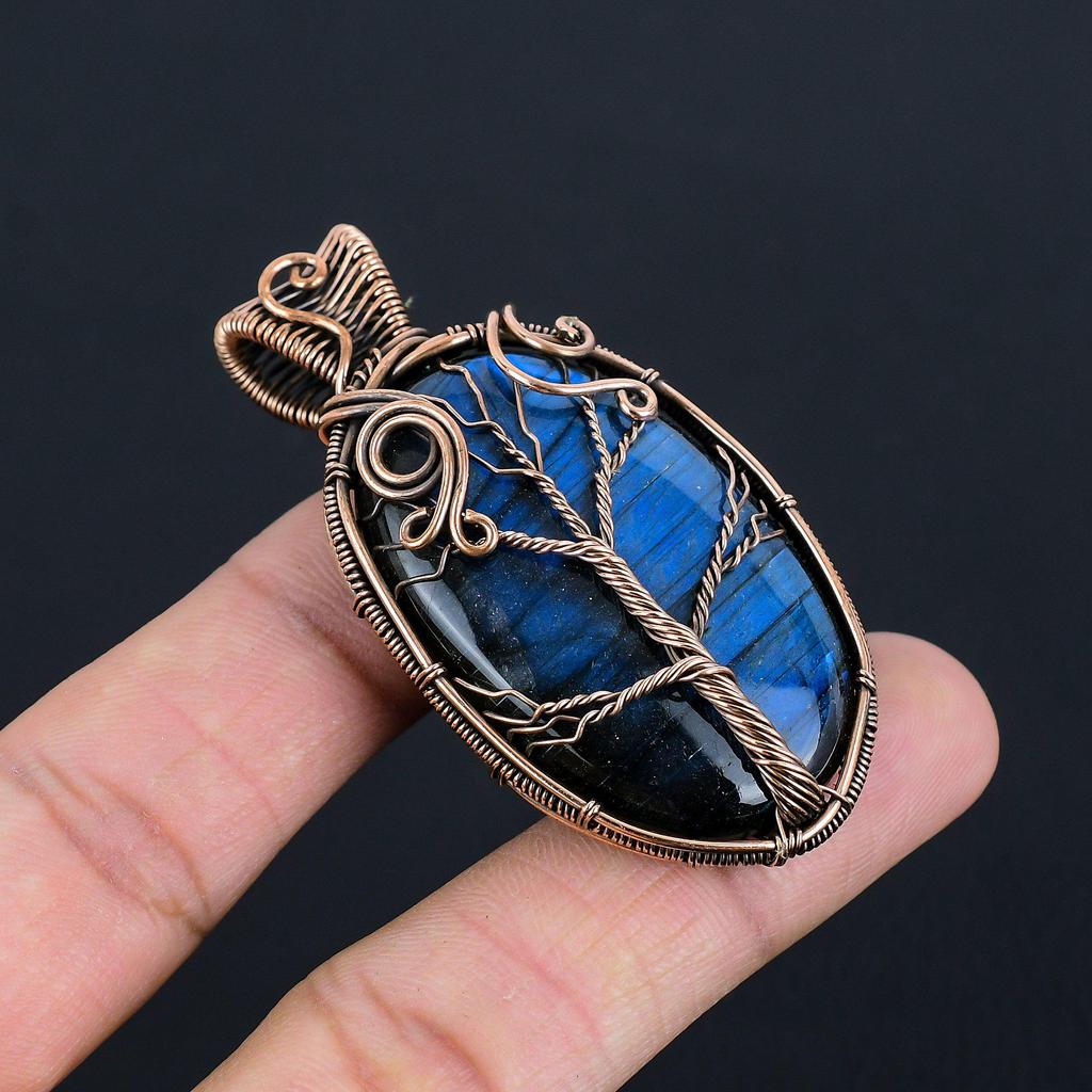 Natürlicher Lebensbaum-Anhänger aus blauem Feuer-Labradorit-Edelstein | Mit oxidiertem Kupferdraht umwickelt | Halskettenanhänger | Kupferschmuck für Sie/Ihn