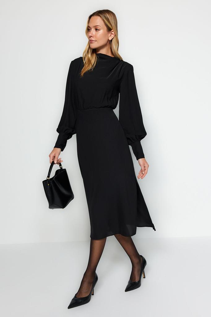 Kleid im Damenstil Schwarzes gewebtes Midikleid mit Schlitz