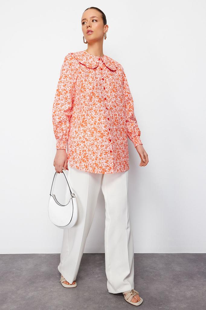 Women's Style Hijab Shirt Red Baby Collar Woven Crispy Flower Patterned Shirt