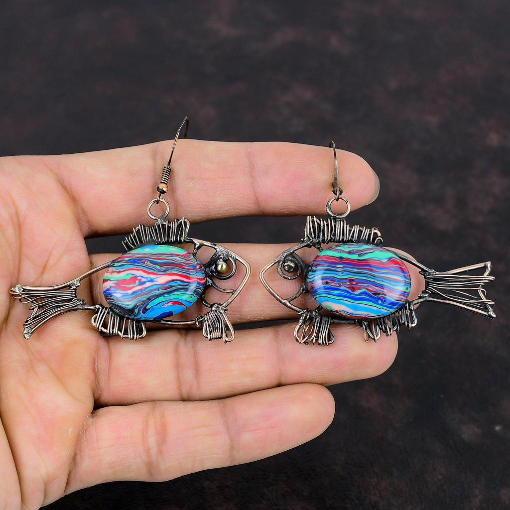 Regenbogen Calsilica Ohrring Kupferdraht umwickelter Schmuck Fisch Ohrring Handgefertigter Edelsteinschmuck Kupferohrring Drahtumwickelter Ohrring Für Geschenke