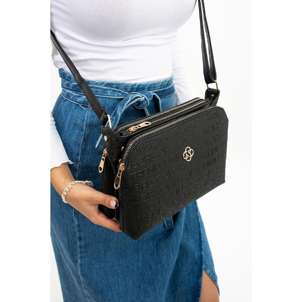 Hochwertige, wasserabweisende Schultertasche mit Kreuzgurt und drei Fächern, in Schwarz mit Textdruck bedruckt