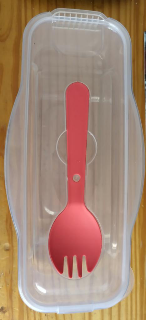 Gut gestaltet: Mit Deckel und Abtropflöchern und einer Gabel und einem Löffel in