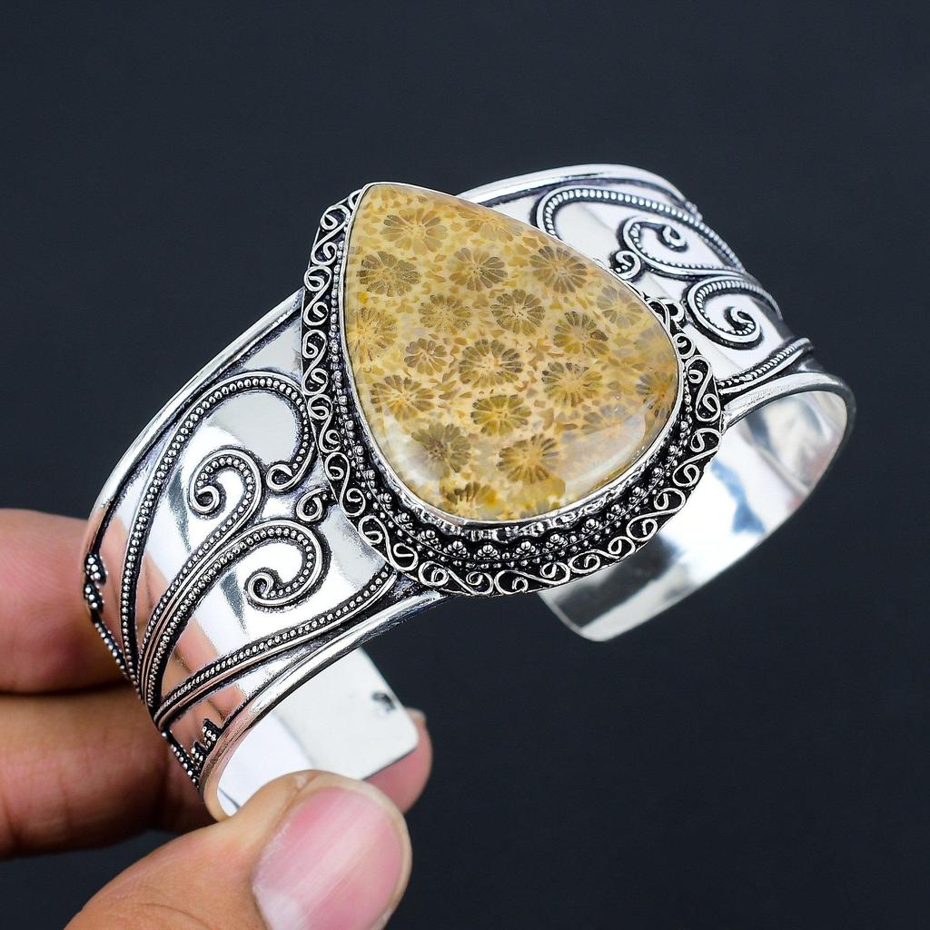Natürlicher Fossilienkorallen Edelstein Silber Armreif | 925 Sterlingsilber | Verstellbarer Armreif | Handgefertigter Silber Armreif Schmuck für Frauen & Mädchen