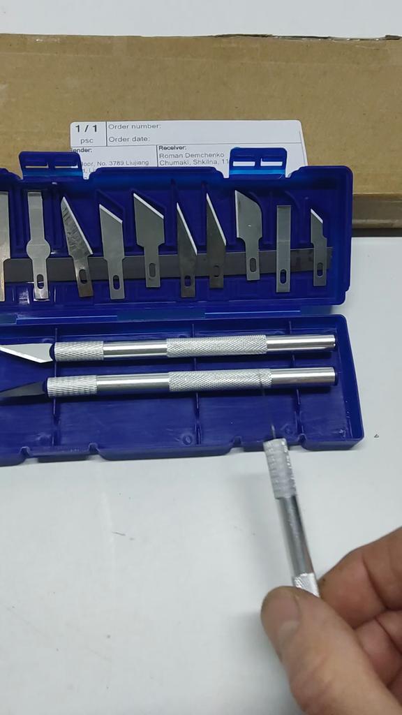 Ganze Schachtel blaues Plastik, Skalpelle drei Stück. Und Klingen verschiedener Form! Danke 🤣