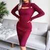 Frauen Herbst Winter Sexy Aushöhlen Einfarbig Lange Ärmel Stricken Schlank Chic Kleid SL