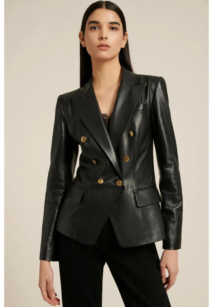 AL KHALID Klassischer echter Lammfell Leder Stilvoller Knopf Damen SCHWARZ Party Blazer